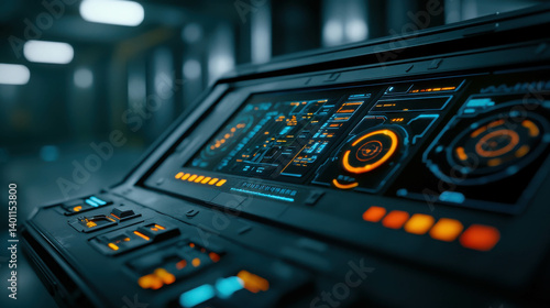 Obraz premium Futuristic Control Panel with High-Tech Interface Displaying Data and...