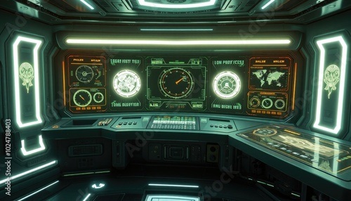 © Rahmat , Obraz premium Futuristic control panel with holographic projections and interactive displays, designed for advanced data management and system control. AI-generated