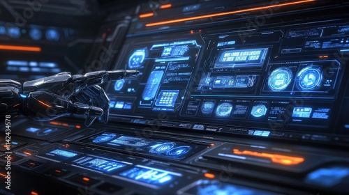 Obraz premium Futuristic Control Panel with Robotic Hands and Interactive Screens