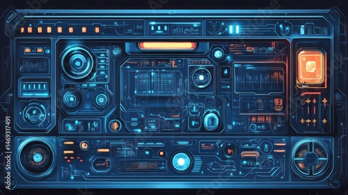© Abdhul, Obraz premium Futuristic control panel with various interactive displays and controls