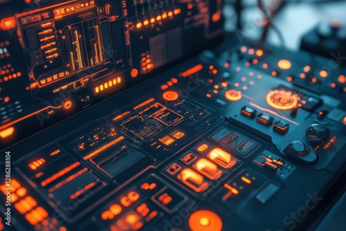 © Fatimah, Fototapeta premium Futuristic Control Panel with Vibrant Neon Interface and Buttons