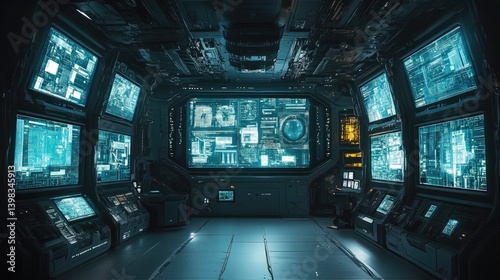 Fototapeta premium Futuristic control room displays data on numerous illuminated screens
