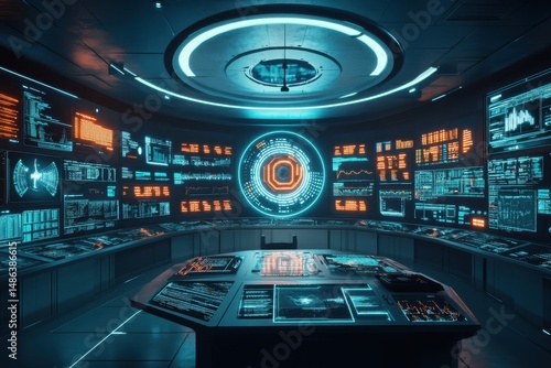 Obraz premium Futuristic control room featuring glowing circular displays and advanced data interfaces, A futuristic control room with a glowing, circular display and a network of screens displaying data