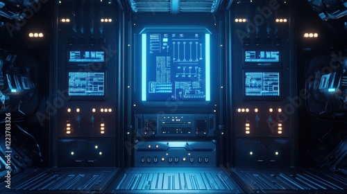© chesleatsz, Obraz premium Futuristic Control Room Interface Displays Data Processing