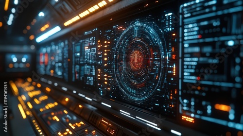Fototapeta premium Futuristic Control Room Interface with Digital Displays, Circuits, and Data Visualization Elements for High-Tech Environments and Sci-Fi Settings