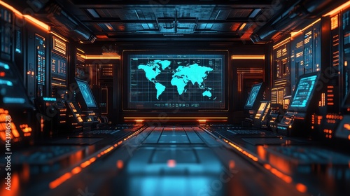 © AI_Nusantara, Obraz premium Futuristic control room interior with world map displayed on a large screen.