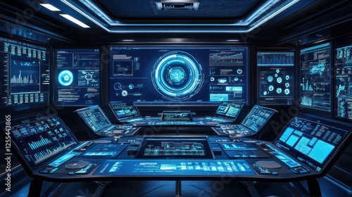 © bani, Obraz premium Futuristic control room monitors data, dark background