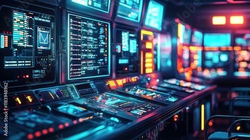 Obraz premium Futuristic Control Room: Neon Lights and Digital Interfaces