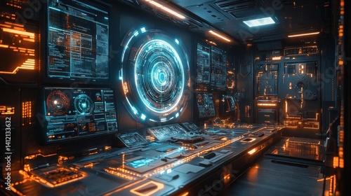 © Alfanachmad, Obraz premium Futuristic Control Room: Neon Lights Illuminate Advanced Technology Interface