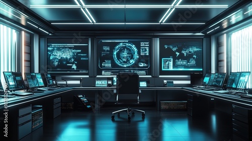 Fototapeta premium Futuristic control room with advanced digital screens and interf