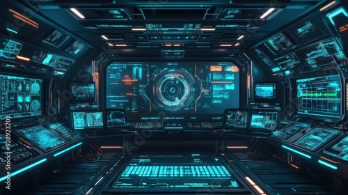 Fototapeta premium Futuristic control room with advanced technology displays and interfaces.