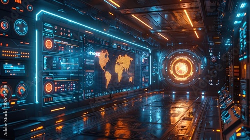 Fototapeta premium Futuristic control room with advanced technology, vibrant screens, and glowing interfaces creating a sci-fi atmosphere.
