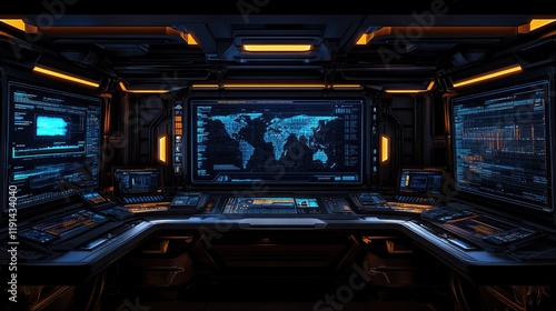Obraz premium Futuristic Control Room with Digital World Map Display for Global Monitoring