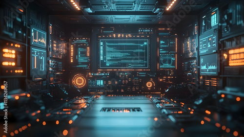 Fototapeta premium Futuristic control room with glowing interfaces and screens displaying data.