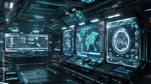 Fototapeta premium Futuristic control room with high-tech displays and interactive interfaces.