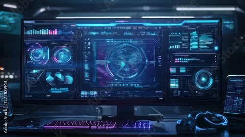 Obraz premium Futuristic control room with high-tech monitors displaying data and analytics...