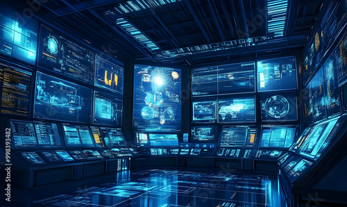 Fototapeta premium Futuristic Control Room with Multiple Digital Screens