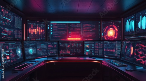 © Almahyra, Obraz premium Futuristic control room with multiple monitors displaying data.