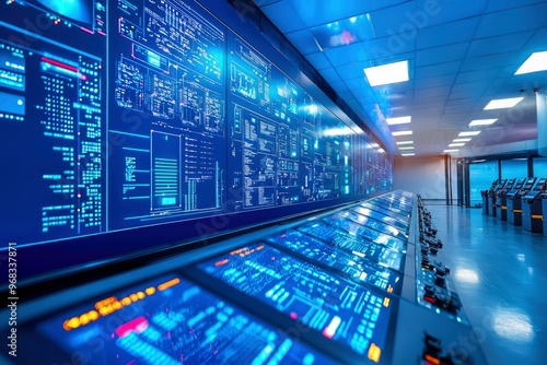Obraz premium Futuristic Control Room with Rows of Monitors Displaying Data