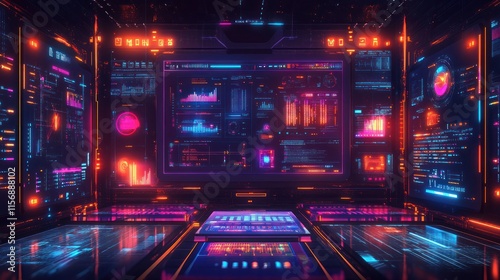 Fototapeta premium Futuristic control room with vibrant digital displays showing data analytics.