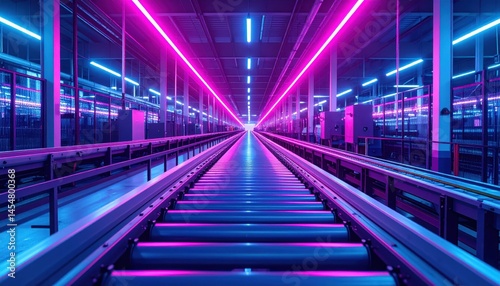 Fototapeta premium Futuristic Conveyor System with Neon Lights in Modern Warehouse