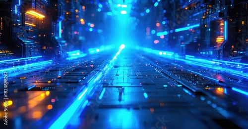 Obraz premium Futuristic corridor, bright blue lights, dark environment. Linear perspective creates depth, technology dominates scene.