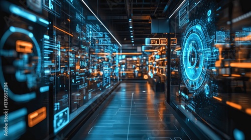 Fototapeta premium Futuristic Corridor Displays Digital Data Streams
