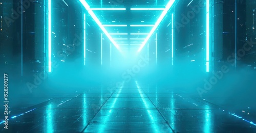Fototapeta premium Futuristic corridor glows with bright cyan lights. Fog fills space, creating...