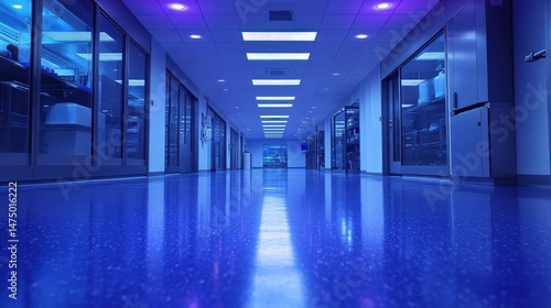 Fototapeta premium Futuristic corridor with blue lighting and glossy floor