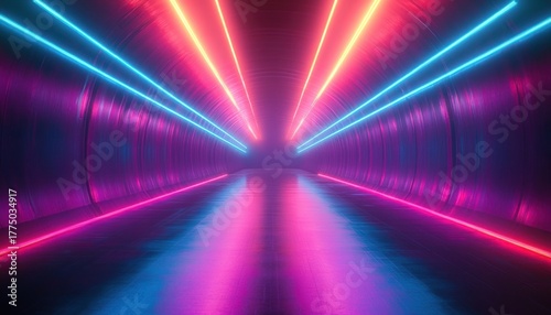 © Milana, Fototapeta premium Futuristic corridor with glowing neon lights in pink, purple, blue, and red creating a vibrant and surreal atmosphere with reflective floor and tunnel walls