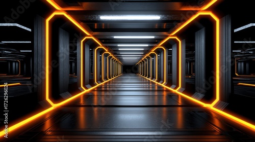 Fototapeta premium Futuristic corridor with glowing orange lights and metallic walls, creating a...