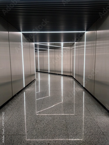 Obraz premium Futuristic corridor with LED light frames and reflective floor