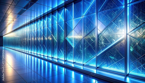 Obraz premium Futuristic corridor with neon-blue lights and reflective glass walls, sci-fi...