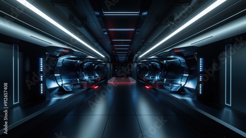 © Pangestune, Fototapeta premium Futuristic Corridor with Red and Blue Neon Lights