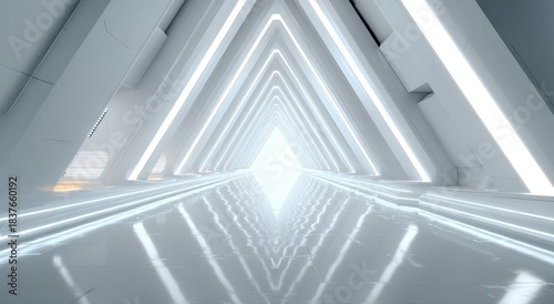 © adriyanca, Obraz premium Futuristic corridor with triangular light frames leading to a bright source