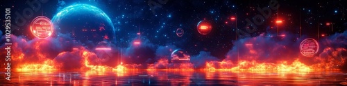 Obraz premium Futuristic Cosmic Landscape with Neon Elements and Fiery Effects