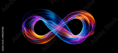 © Irina Ermakova, Fototapeta premium Futuristic creative infinity symbol on black background glowing with neon colors. Abstract colorful waves and lines. Generative AI