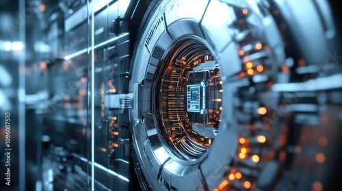 Fototapeta premium Futuristic cryptocurrency vault featuring complex security systems, high-tech metallic surfaces, and digital interfaces, with a cinematic atmosphere and advanced design