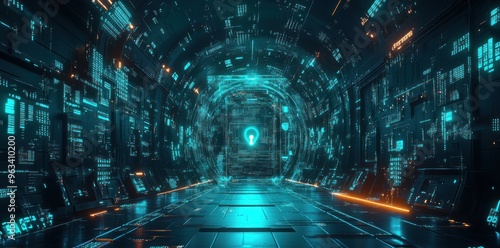 © Npicture, Obraz premium Futuristic Cyber Tunnel with Glowing Keyhole and Data Streams