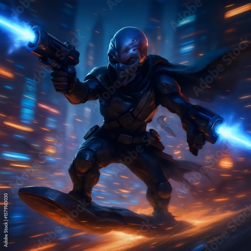© yuu, Fototapeta premium Futuristic Cyber Warrior on Hoverboard with Dual Blasters