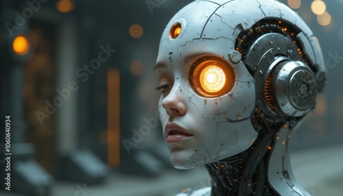 Fototapeta premium Futuristic Cybernetic Face with Glowing Eye and Intricate Machinery