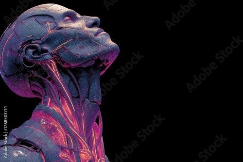 Naklejka premium Futuristic cybernetic humanoid with vibrant neural and mechanical detailing