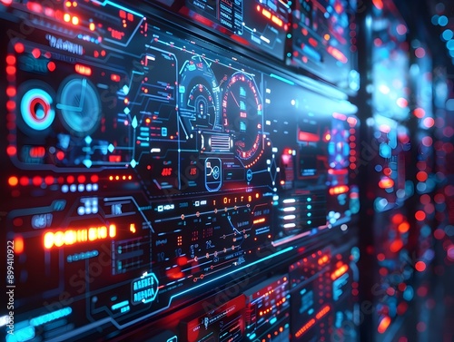 Obraz premium Futuristic Cybernetic Interface with Floating Data Panels and Touch Controls...