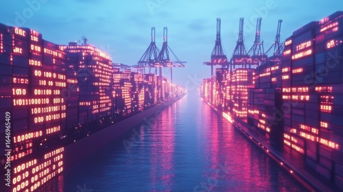 © Ilja, Fototapeta premium Futuristic Cybernetic Maritime Trade Hub at Dusk, Illuminated by Binary Code and Advanced Logistics