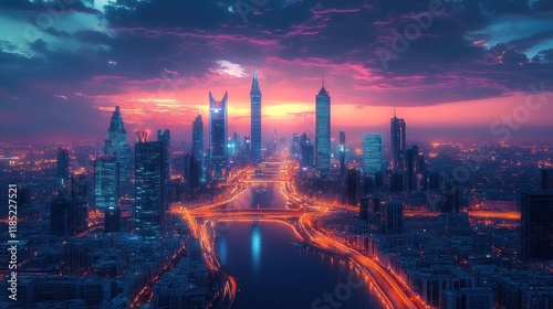 Fototapeta premium Futuristic Cyberpunk City Skyline at Night with Neon Lights and Reflective...