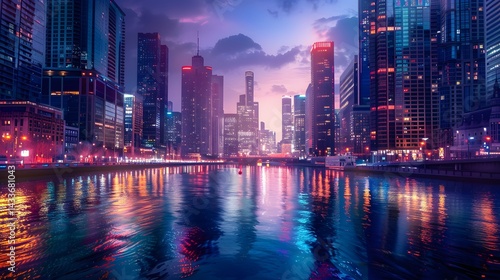 © Amy's Atelier, Fototapeta premium Futuristic Cyberpunk City Skyline at Sunset Reflected on Calm River Water