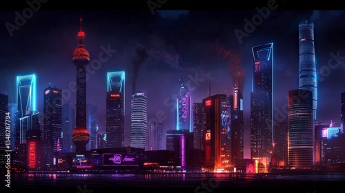 © Narongsag, Obraz premium Futuristic Cyberpunk Cityscape Neon Lights Skyline Modern Architecture