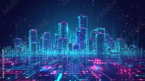 Fototapeta premium Futuristic cyberpunk cityscape with buildings and a skyline in the background
