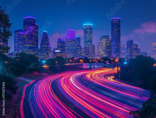 © MoriumAkter, Fototapeta premium Futuristic Cyberpunk Cityscape with Neon Light Trails from Fast-Moving Cars and Illuminated Skyscrapers at Night