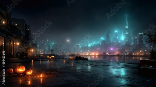 © Verapat, Fototapeta premium Futuristic cyberpunk halloween cityscape glowing neon jack o lanterns digital art concept vibrant night scene mysterious atmosphere